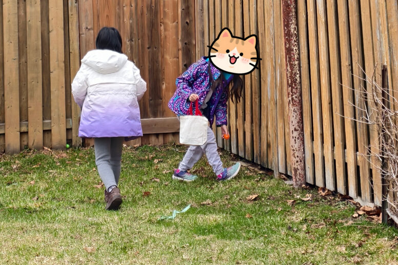 During the egg hunt in the backyard, the eggs held more than just candy—they also contained Chinese character cards and small parent-child interaction tasks.