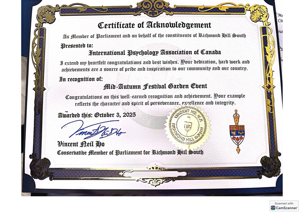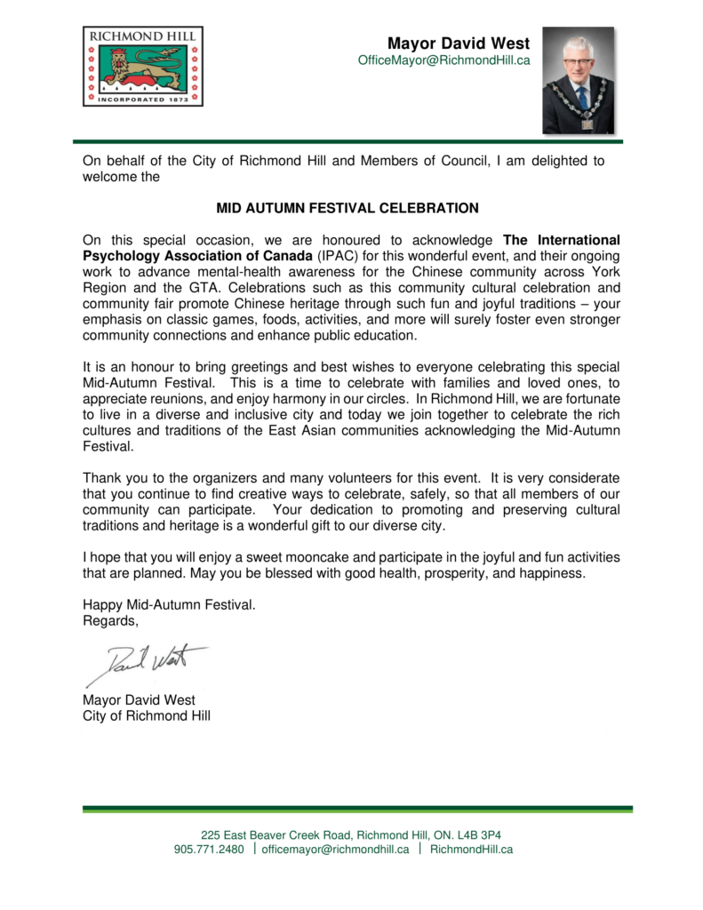 在此,IPAC感谢国会议员Alan Ho,Richmondhill 市长Mayor West,Simon Cui出席活动并颁发贺信与证书,感谢副市长Godwin Chan 的出席。